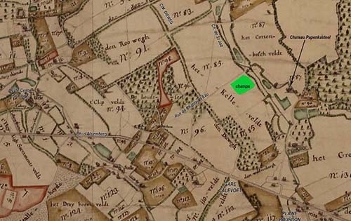 (ainsi que sur une carte routière actuelle (2011), (jouxtant l’emplacement du champ actuellement en construction, en vert)